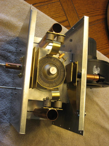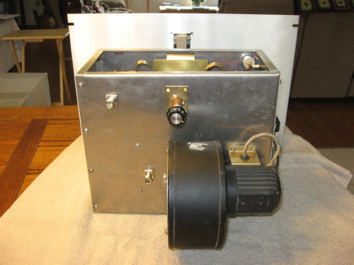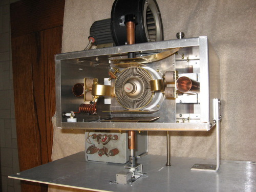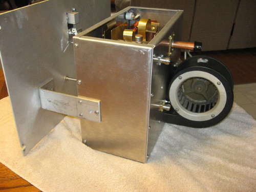 Testing of 2m-8877:I discovered that using a galvanized steel screen for the cover of the amplifier enclosure was not the best choice. Apparently, a magnetic metal is subject to higher circulating RF currents. First, I mounted the 1/4 wavelength copper lines too high such there was indadequate clearance between the anode straps and the top cover (3/16-inch). This resulted in a HV flashover (arc) to occur resulting in a very small spot to appear on the screen directly above the anode straps (carrying high RF currents). I deformed the straps to increase the air gap between the anode straps and the enclosure cover. My solution resulted in RF heating in the area directly above the straps (see photo). Two large dark circles appeared in the mesh directly above the anode straps. My solution was to use the original sheet aluminum cover and make a large vent by drilling a pattern of 3/8-inch holes too form a vent. To this I add a six-inch radial fan above the vent to aid air flow out of the anode cavity. The cover was raised by using 3/4 square channel as a spacer around the upper lip of the enclosure. This resulted in roughly 1-inch separation of the anode straps to the cover. This worked out well, with no HV arcing or heating evident. I have now run about ten hours time on the amplifier (March 3, 2009), with it preforming very reliably. Oct. 18, 2010 - Testing the CAI HVPS: