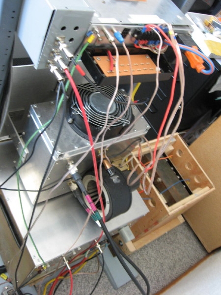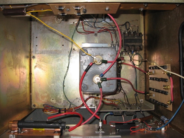 - Top view of the modified HVPS showing filter cap and 240v relay in center with HV bridge to right.