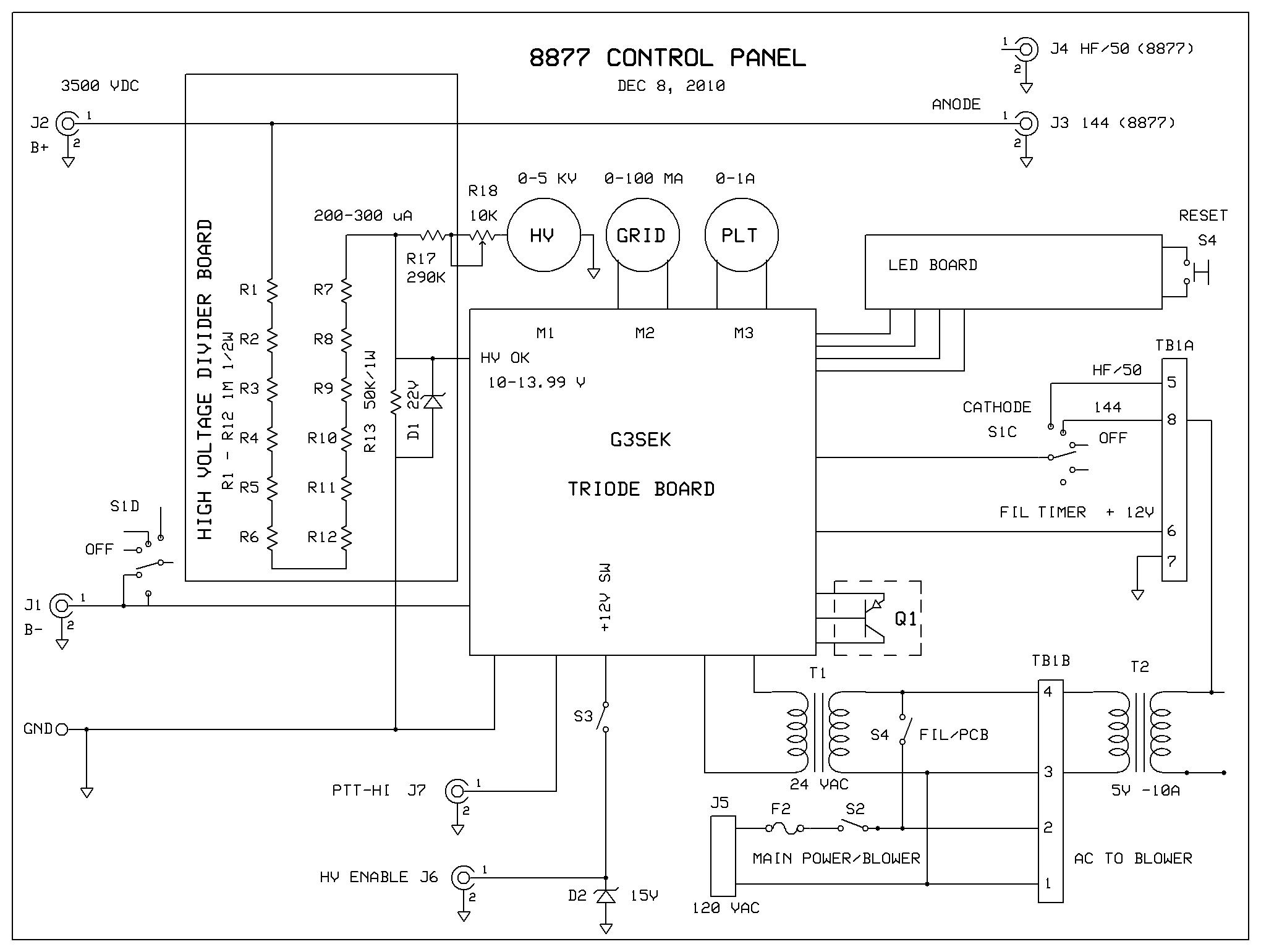 I will try adjusting the ouput load capacitor and more drive to get more RF output. Atempting to drive the 8877 with 50w using a solid-state amplifier resulted in a flashover on the -HV line. Dec. 7, 2010 - Testing the CAI HVPS: The HV power supply has been modified to capacitive input by removal of the filter choke an redesign of the bleeder; slow-start circuit on the primary of the HV transformer and relocation of HV surge and fuse to the HVPS. The Bias control transistor and a mosfet switch were found to be shorted and replaced in the Control panel. Schematic