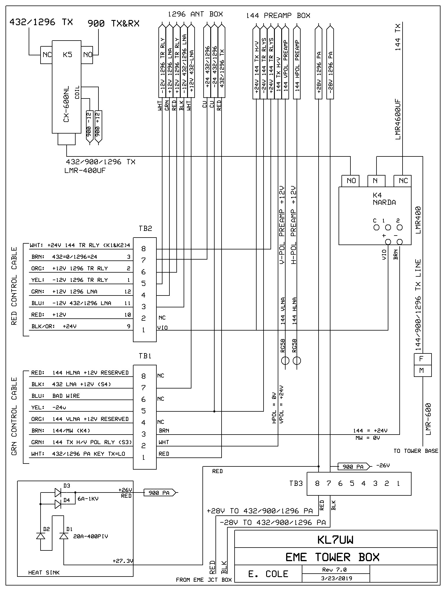 EME Tower Box has been wired to add a NARDA SEM123N relay for switching between 144-eme and 900/1296 MHz equipment.