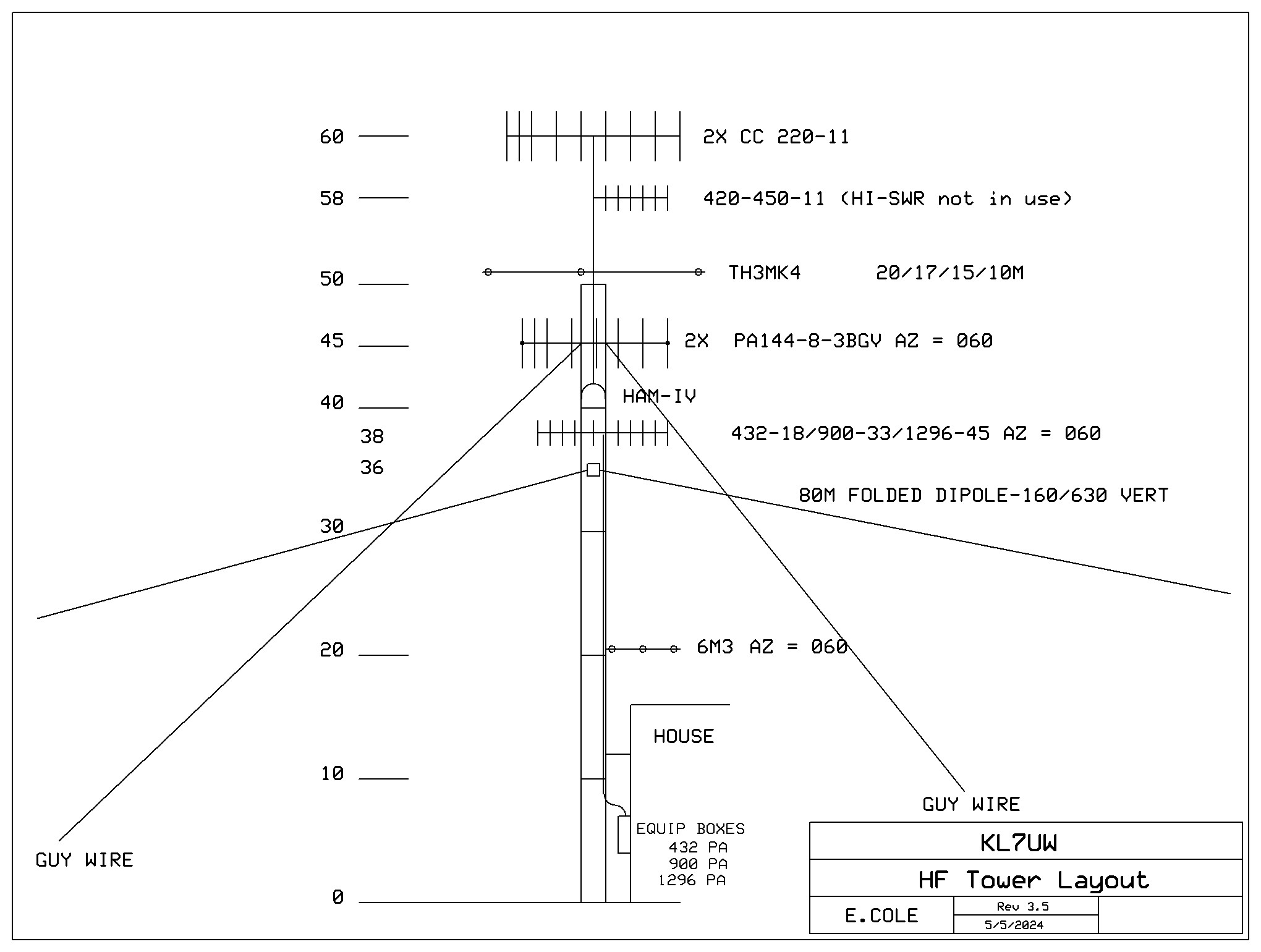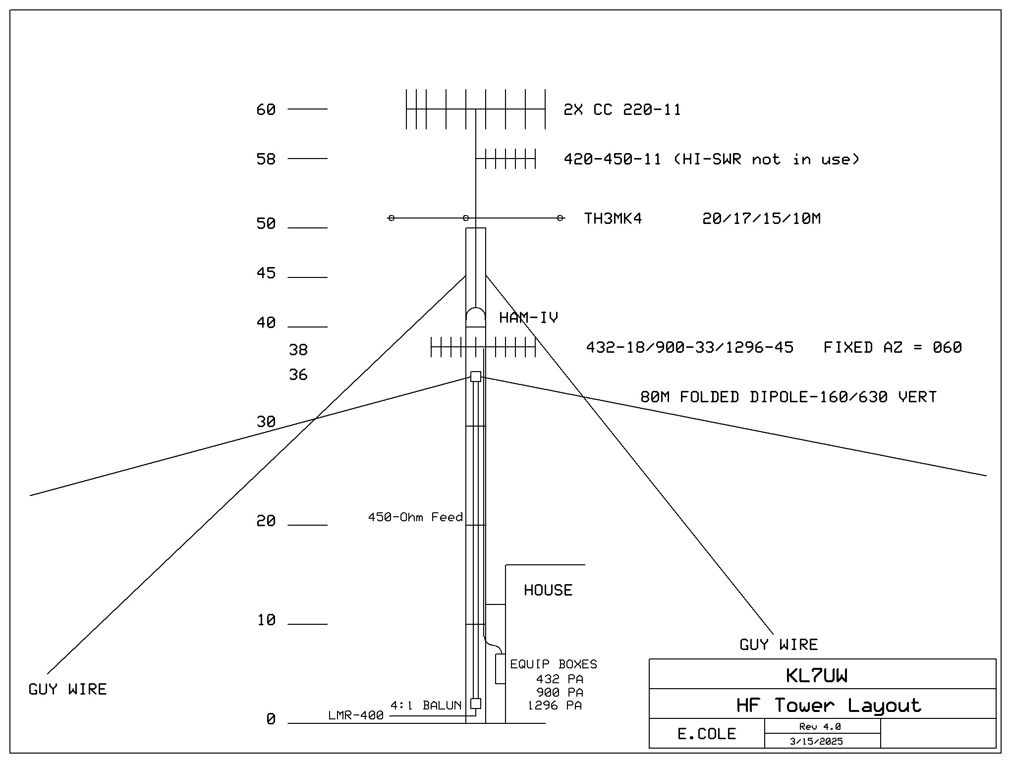 The 2m antennas are installed on the HF tower at 38-feet (below the HF beam) and antennas for 432, 900, and 1296 MHz
