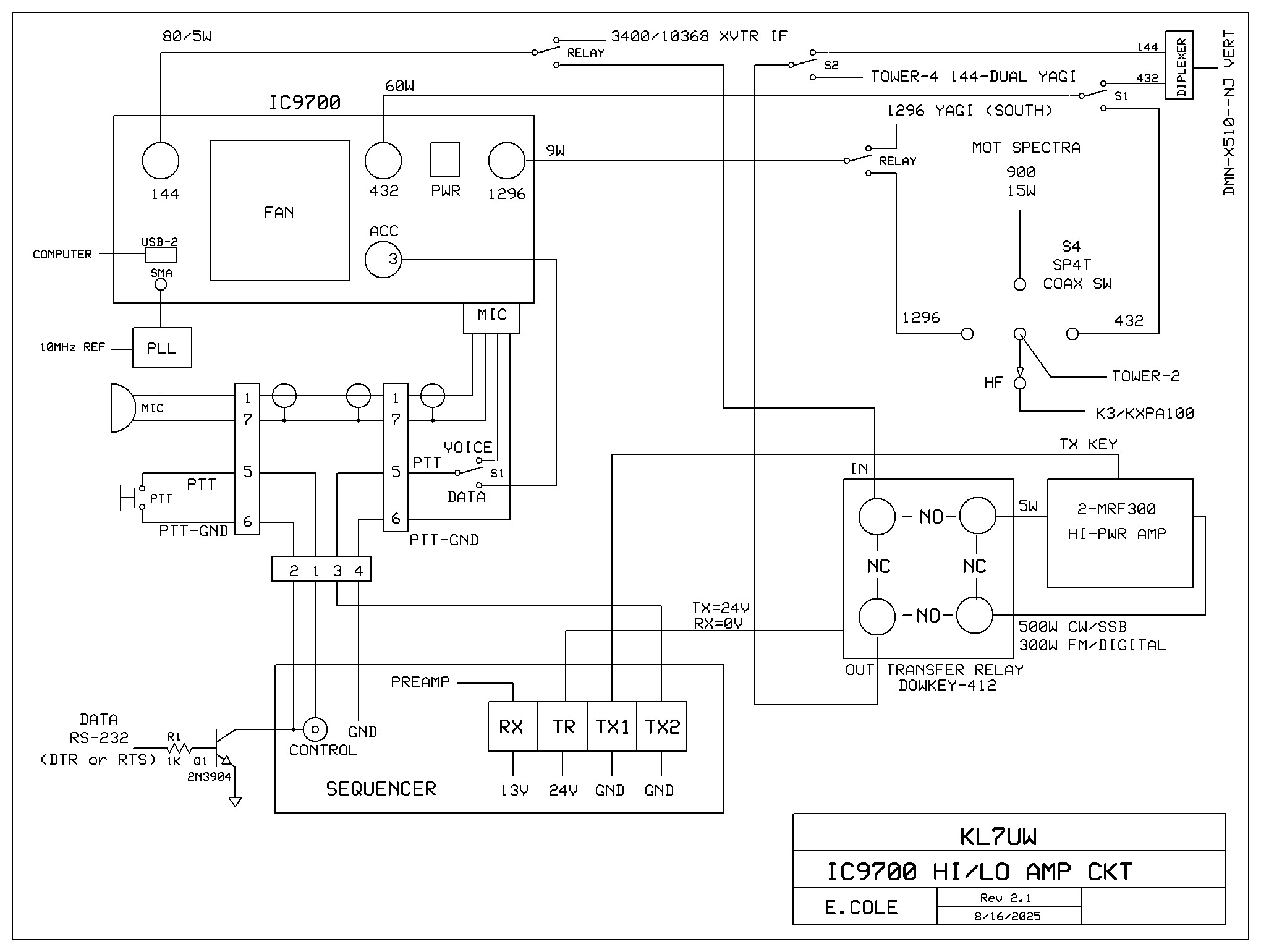 Below are the diagrams for a PTT control circuit to delay microphone PTT for use of an in-line preamp installed with a bypass coax relay: