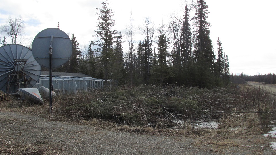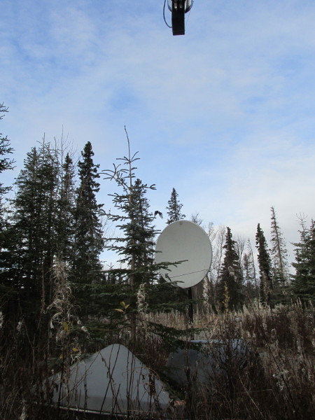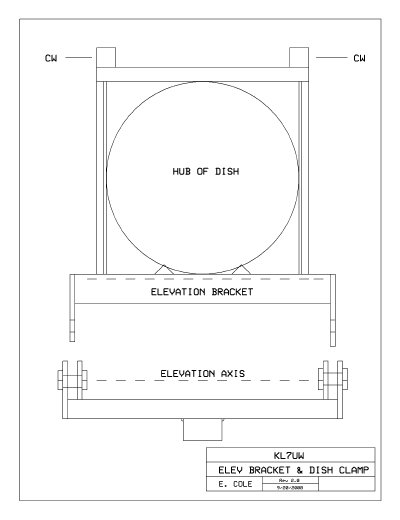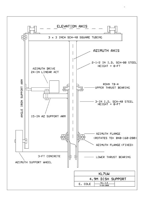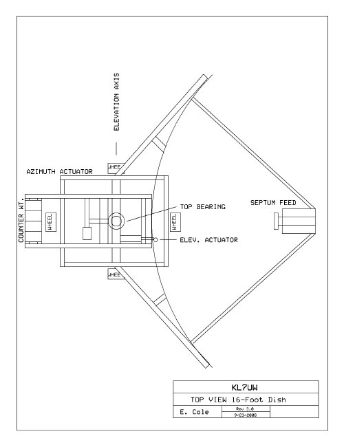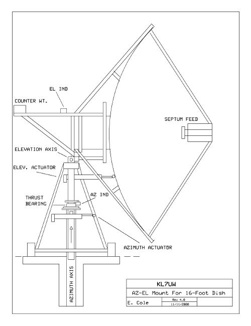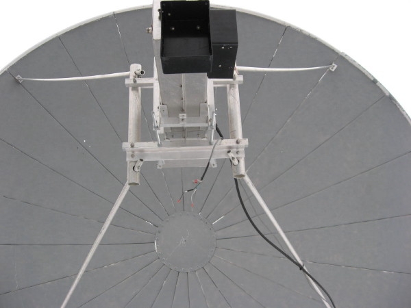 The dish mount permits az-movement in three stages: 080-156, 156-245, and 245-310 degrees (recently re-programmed).
