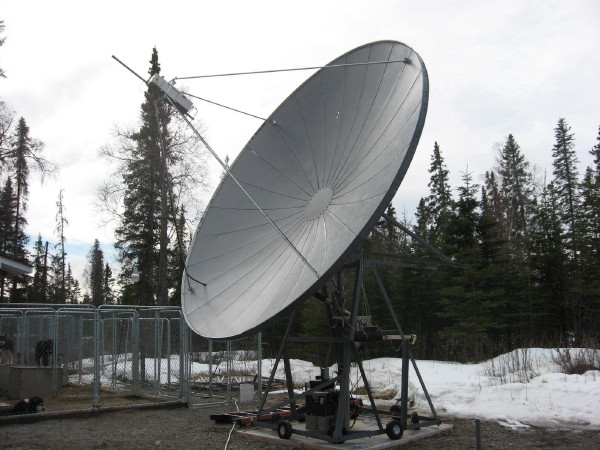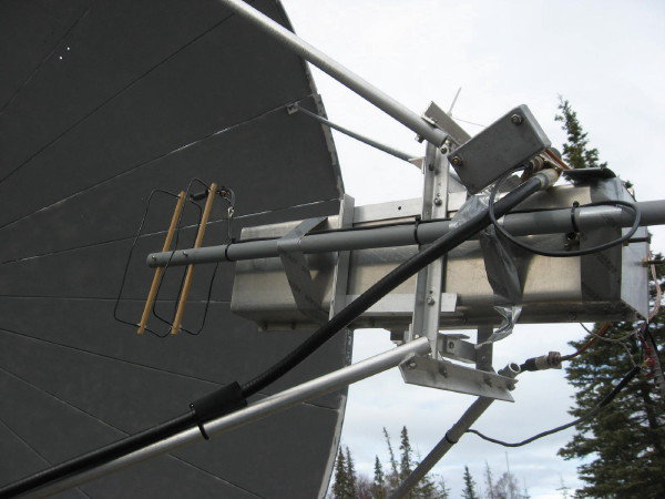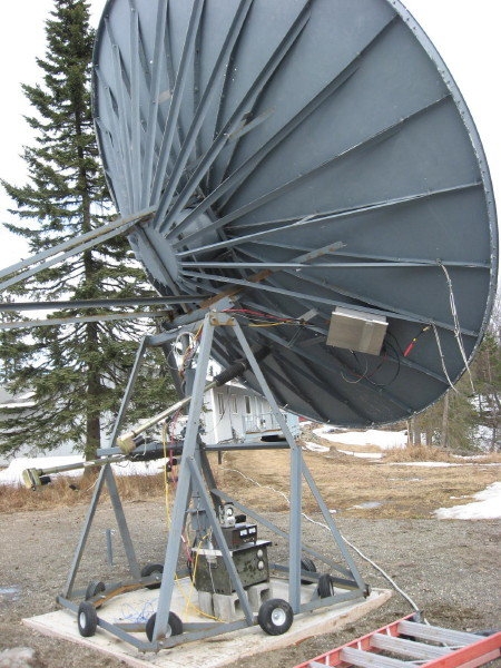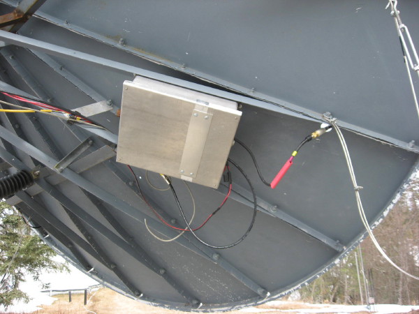 The 4.9m dish has being used which is equivalent in gain to four yagis. Current feed is
