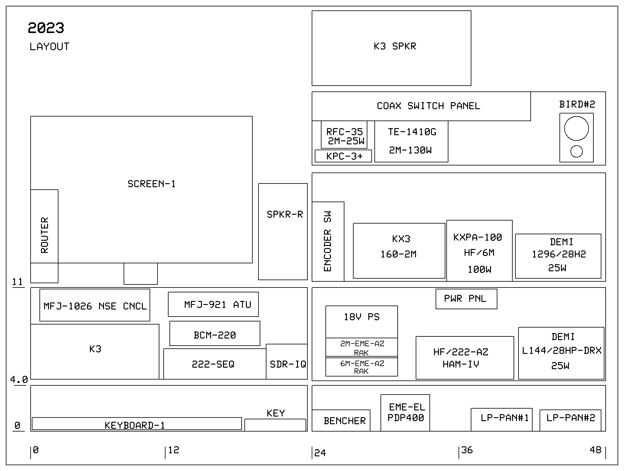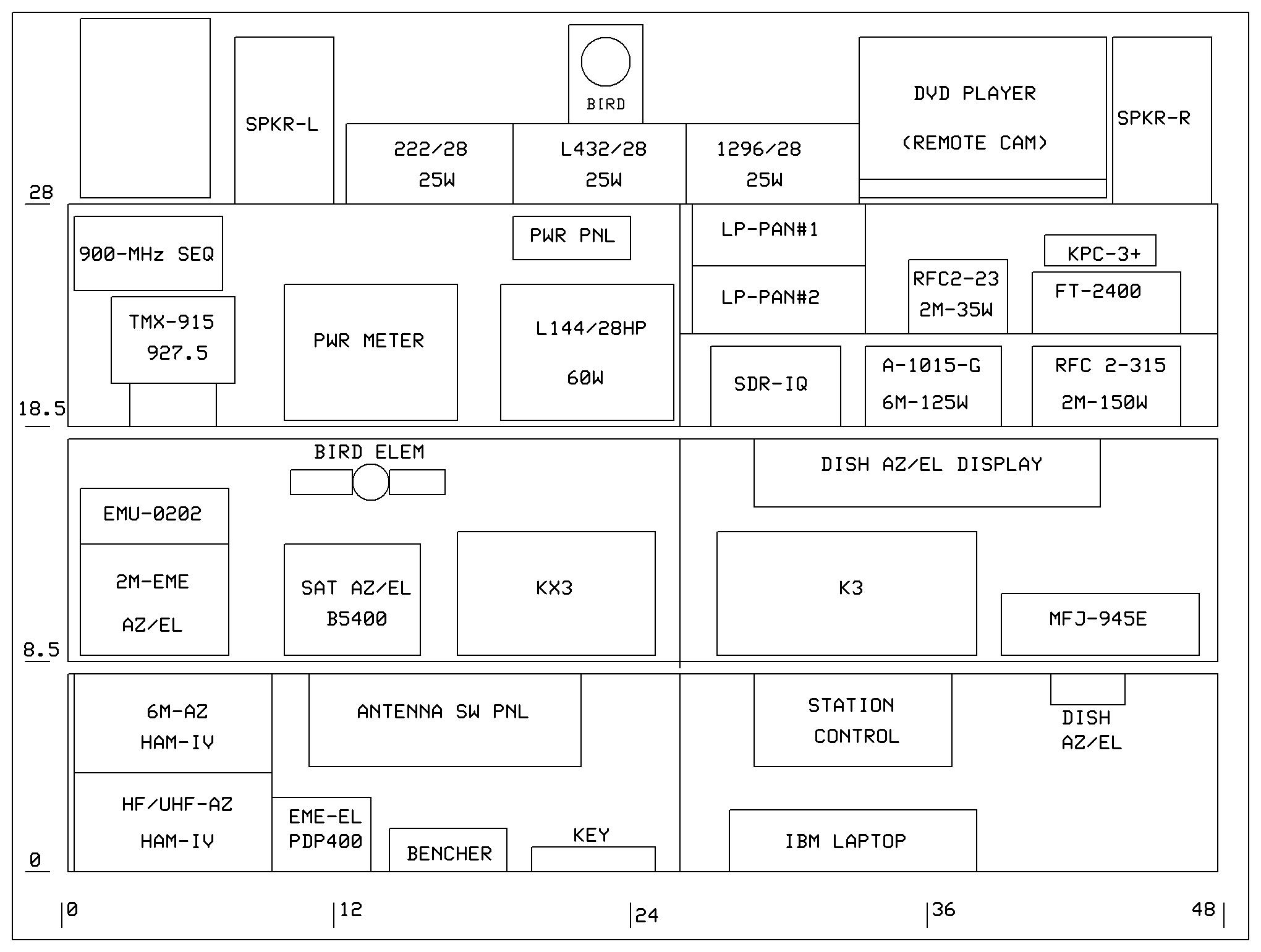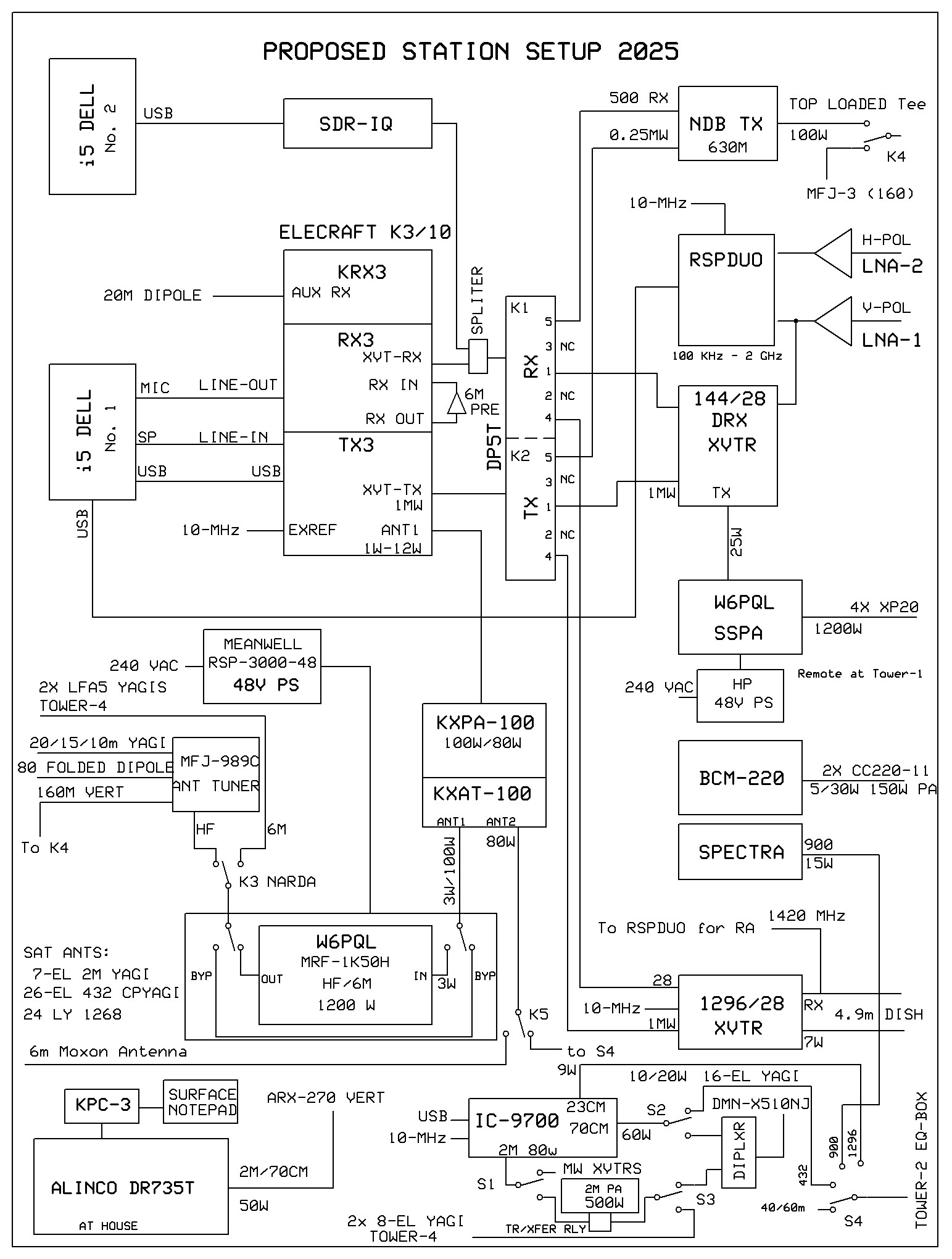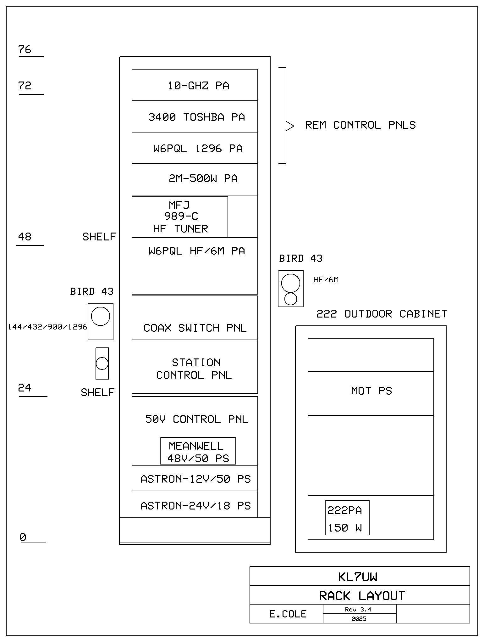 2025 Station Photos in new Hamshack (to be shown here). 2025 Station Block Diagram and Proposed Station, Rack Layout with 222 Remote Equipment Enclosure: