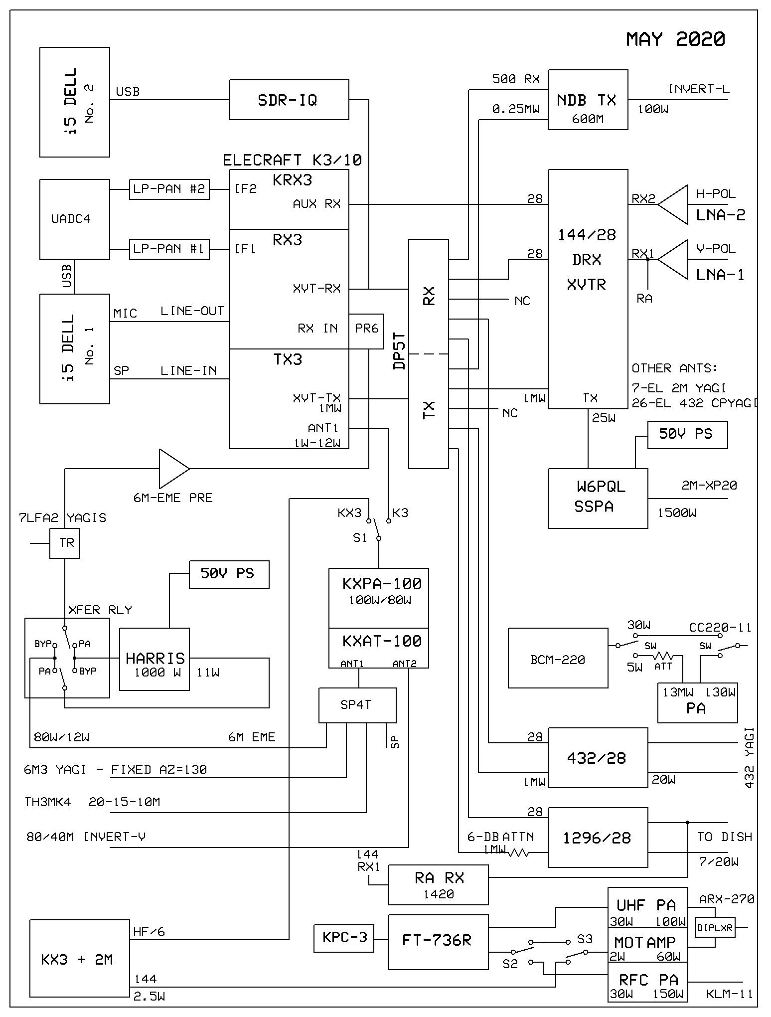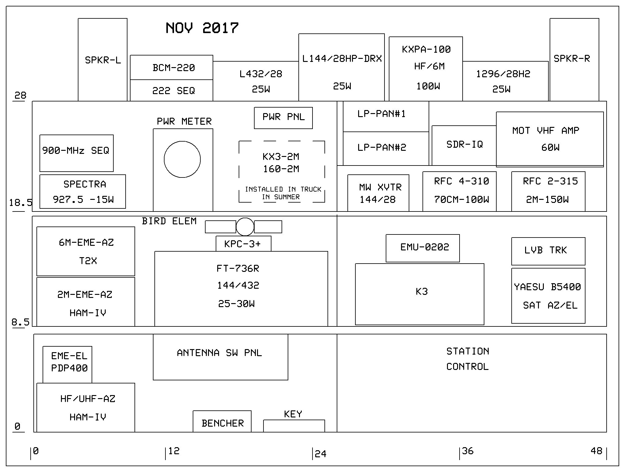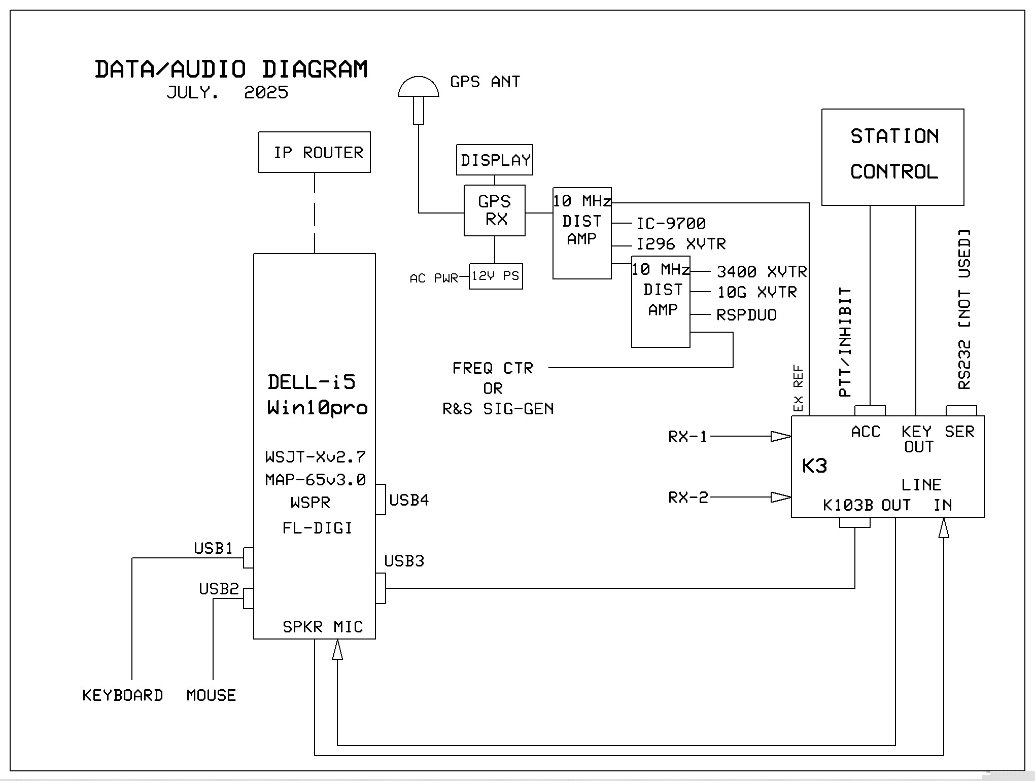 2025 Station Photos in new Hamshack (to be shown here). 2025 Station Block Diagram and Proposed Station, Rack Layout with 222 Remote Equipment Enclosure: